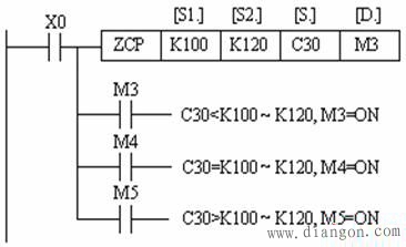 ZCP指令是将一个操作数[S.]与两个操作数[S1.]和[S2.]形成的区间比较,且[S1.]不得大于[S2.],结果送到[D.]中。ZCP指令使用说明如图所示。