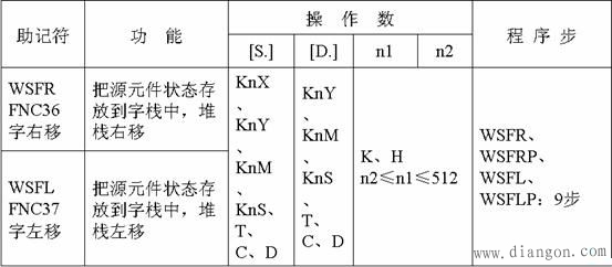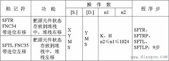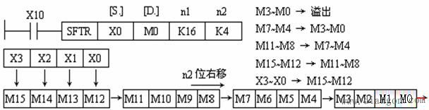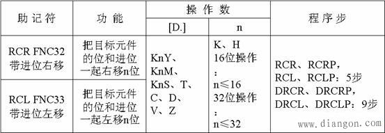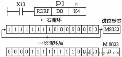 执行RCR、RCL指令时,各位的数据与进位位M8022一起(16位指令时一共17位)向右(或向左)循环移动n位。在循环中移出的位送入进位标志,后者又被送回到目标操作元件的另一端。