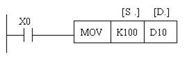 (1)传送指令MOV (D)MOV(P)指令的编号为FNC12,该指令的功能是将源数据传送到指定的目标。如图3所示,当X0为ON时,则将[S.]中的数据K100传送到目标操作元件[D.]即D10中。在指令执行时,常数K100会自动转换成二进制数。当X0为OFF时,则指令不执行,数据保持不变。
