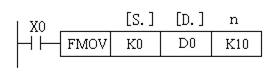 (5)多点传送指令FMOV (D)FMOV(P)指令的编号为FNC16。它的功能是将源操作数中的数据传送到指定目标开始的n个元件中,传送后n个元件中的数据完全相同。如图7所示,当X0为ON时,把K0传送到D0~D9中。