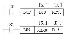 1)源操作数可取所有数据类型,目标操作数可为KnY、KnM、KnS、T、C、D、V、Z.,若源数据为常数K,则该数据会自动转换为二进制数。
