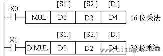 (3)乘法指令MUL (D) MUL (P)指令的编号为FNC22。数据均为有符号数。如图3所示,当X0为ON时,将二进制16位数[S1.]、[S2.]相乘,结果送[D.]中。D为32位,即(D0)×(D2)→(D5,D4)(16位乘法);当X1为ON时,(D1,D0)×(D3,D2)→(D7,D6,D5,D4)(32位乘法)。