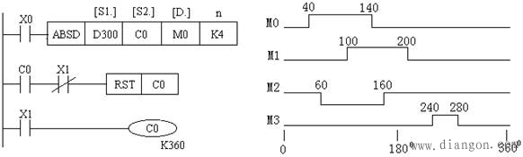 绝对值式凸轮顺控指令ABSD是用来产生一组对应于计数值在3600范围内变化的输出波形,输出点的个数由n决定,如图1a所示。图中n为4,表明[D.]由M0~M3共4点输出。预先通过MOV指令将对应的数据写入D300~D307中,开通点数据写入偶数元件,关断点数据放入奇数元件,如表1所示。当执行条件X0由OFF变ON时,M0~M3将得到如图1b所示的波形,通过改变D300~D307的数据可改变波形。若X0为OFF,则各输出点状态不变。这一指令只能使用一次。
