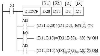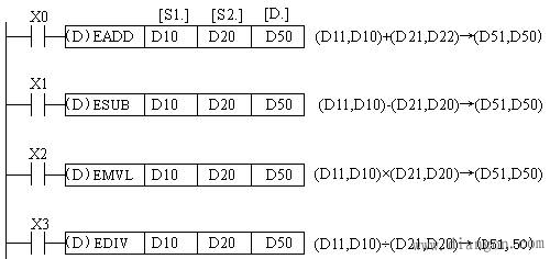 (3)二进制浮点数的四则运算指令 浮点数的四则运算指令有加法指令EADD (FNC120)、减法指令ESUB(FNC121)、乘法指令EMVL(FNC122)和除法指令EDIV(FNC123)四条指令。四则运算指令的使用说明如图3所示,它们都是将两个源操作数中的浮点数进行运算后送入目标操作数。当除数为0时出现运算错误,不执行指令。此类指令只有32位运算,占13个程序步。(http://www.diangon.com/版权所有)运算结果影响标志位M8020(零标志)、M8021(借位标志)、M8022(进位标志)。源操作数可取K、H和D,目标操作数为D。如有常数参与运算则自动转化为浮点数。