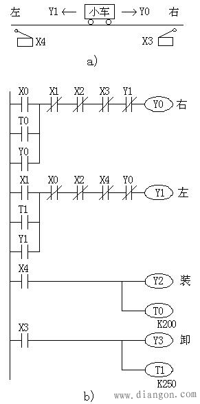 (2)程序设计思路 以众所周知的电动机正反转控制的梯形图为基础,设计出的小车控制梯形图如图1b所示。为使小车自动停止,将X3和X4的常闭触点分别与Y0和Y1的线圈串联。为使小车自动起动,将控制装、卸料延时的定时器T0和T1的常开触点,分别与手动起动右行和左行的X0、X1的常开触点并联,并用两个限位开关对应的X4和X3的常开触点分别接通装料、卸料电磁阀和相应的定时器。