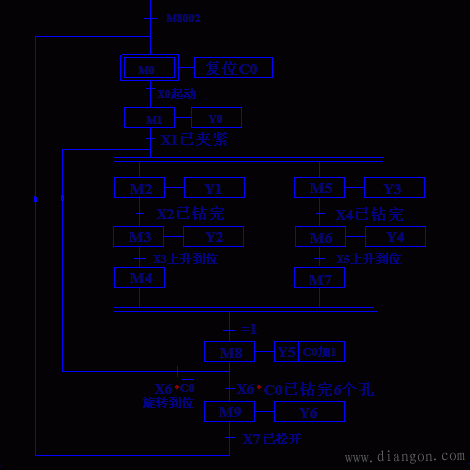 一、实验目的 1. 通过设计和调试复杂系统的顺序控制程序,熟悉复杂的顺序控制程序的设计和调试方法。 2. 通过设计复杂顺序控制程序的功能表图,熟悉和掌握选择序列的分支编程方法、选择序列的合并编程方法。 3. 熟练掌握复杂顺序控制程序的调试方法。 二、实验内容 某专用钻床用来加工圆盘状零件上均匀分布的6个孔,操作人员放好工件后,按下起动按钮X0,Y0变为ON,工件被夹紧,夹紧后压力继电器X1为ON,Y1和Y3使两个钻头同时开始工作,钻到由限位开关X2和X4设定的深度时,Y2和Y4使两个钻头同时上行,升到由限位开关X3和X5设定的起始位置时停止上行。两个都到位后,Y5使工件旋转600,旋转到位时,X6为ON,同时设定值为3的计数器C0的当前值加1,旋转结束后,又开始钻第二对孔。3对孔都钻完后,计数器的当前值等于设定值3,Y6使工件松开,松开到位时,限位开关X7为ON,系统返回初始状态。系统的顺序控制功能表图如图1所示,画出plc的外部接线图。