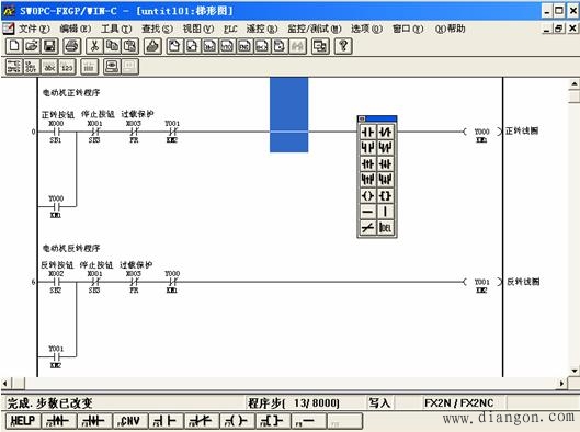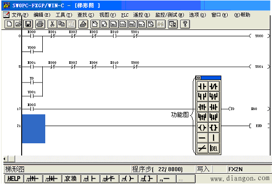 首先将光标(深蓝色矩形)放在编辑窗口中欲放置元件的位置,然后在功能图中选择元件类型,例如要输入定时器指令或计数器指令,需用鼠标点击上图中的“