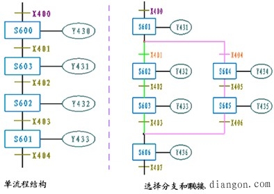 当并行分支的入口条件满足时,几个分支的第一个状态器同时被置位;各分支,各自按照程序向下执行。当且仅当,各分支程序执行结束(各分支最后一个状态器都处于置位状态),在公共转移条件(分支出口条件)接通的条件下,置位“联接”后的状态器,同时,各分支最后一个状态器同时复位。