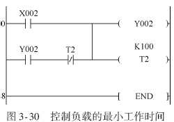 如图3-30所示的程序可以实现控制负载的最少工作时间。该程序实现的控制功能是,输出信号Y2的最少工作时间为10s。