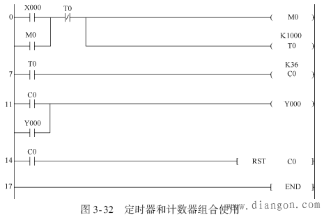 图3-31是用两个定时器完成1.5h的定时,定时时间到,Y0得电。