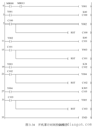 PLC运行累计时间控制电路可以通过M8000, M8013和计数器等组合使用,编制秒、分、时、天、年的显示电路。在这里,需要使用断电保持型的计数器(C100~C199),这样才能保证每次开机的累计时间能计时,如图3-34所示。