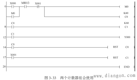 以M8013 (1s的时钟脉冲)作为计数器C0的计数脉冲。当X0接通时,计数器C0开始计时。