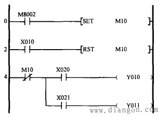 【实例实现】加电输出禁止程序运用了三菱plc的特殊辅助继电器M8002, M8002为加电接通一个扫描周期,使M10置位为“1", Y010和Y011无论在X020、 X021处于什么状态,均无输出,该程序如图所示。