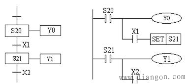 图1 状态转移图与步进指令 状态转移图中的每一步包含三个内容:本步驱动的内容,转移条件及指令的转换目标。如图3-25中S20步驱动Y0,当X1有效为ON时,则系统由S20状态转为S21状态,X1即为转换条件,转换的目标为S21步。状态转移图与梯形图的对称关系也显示在图4-14中。 3.步进指令的使用说明 1)STL触点是与左侧母线相连的常开触点,某STL触点接通,则对应的状态为活动步; 2)与STL触点相连的触点应用LD或LDI指令,只有执行完RET后才返回左侧母线; 3)STL触点可直接驱动或通过别的触点驱动Y、M、S、T等元件的线圈; 4)由于plc只执行活动步对应的电路块,所以使用STL指令时允许双线圈输出(顺控程序在不同的步可多次驱动同一线圈); 5) STL触点驱动的电路块中不能使用MC和MCR指令,但可以用CJ指令; 6)在中断程序和子程序内,不能使用STL指令。 |