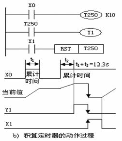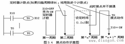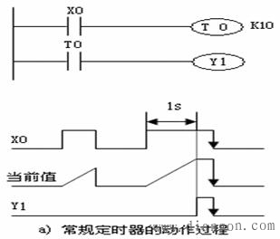 接点动作时序如图所示。定时器在其线圈被驱动后开始计时,到达设定值后,在执行第一个线圈指令时,其输出接点动作。从驱动定时器线圈到其接点动作称为定时器接点动作精度时间t,t=T+T0-α。