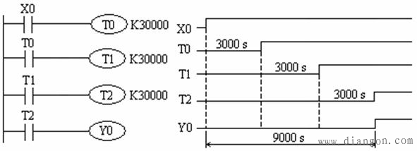 三菱FX2N系列plc定时器的最长定时时间为3276.7s,如果需要更长的定时时间,可以采用以下方法以获得较长延时时间 。 1、多个定时器组合电路 如图所示。当X0接通,T0线圈得电并开始延时,延时到T0常开触点闭合,又使T1线圈得电,并开始延时,当定时器T1延时到,其常开触点闭合,再使T2线圈得电,并开始延时,当定时器T2延时到,其常开触点闭合,才使Y0接通。因此,从X0为ON开始到Y0接通共延时9000s。  2、定时器和计数器组合 当X1为ON时,T1开始定时,0.6s后T1定时时间到,其常闭触点断开,使它自己复位,复位后T1的当前值变为0,同时它的常闭触点接通,使它自己的线圈重新通电,又开始定时。T1将这样周而复始地工作,直至X1变为OFF。从分析中可看出,最上面一行电路是一个脉冲信号发生器,脉冲周期等于T1的设定值。产生的脉冲列送给C0计数,计满3个数后,C0的当前值等于设定值,它的常开触点闭合,Y0开始输出。 |