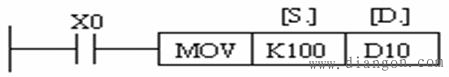 MOV指令将源操作数的数据传送到目标元件中,即[S.]→[D.]。MOV指令的使用说明如图所示。当X0为ON时,源操作数[S.]中的数据K100传送到目标元件D10中。当X0为OFF,指令不执行,数据保持不变。