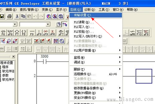 5,回到plc编程软件,选择“在线”菜单栏,从下拉菜单中选择“传输设置”。