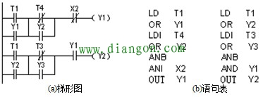 由2个及以上的接点进行并联的电路称为并联电路块,将并联电路块进行串联连接时,使用指令ANB。分支的起点用LD、LDI指令,分支结束后,使用ANB指令与前面电路串联。ANB指令的使用说明如图所示。