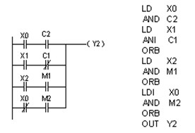 由2个及以上的接点进行串联的电路称为串联电路块,将串联电路块进行并联时,使用指令ORB。分支的开始用LD、LDI指令,分支结束用ORB指令。ORB指令与ANB指令均为无目标元件指令,步长为1步。ORB指令的使用说明如图所示。