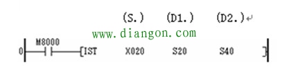 1、IST指令是在自动控制中对步进阶梯的状态初始化及特殊辅助继电器的切换指令,操作数中各项的意义如下:源(S.)为指定运行模式的初始输入,共8个连续的元件,其指定的软元件如下,设源(S.)为X0,则