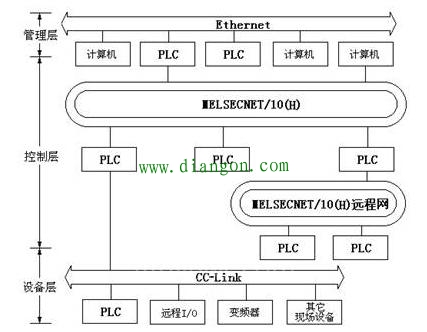 1、信息层/Ethernet(以太网) 信息层为网络系统中最高层,主要是在PLC、设备控制器以及生产管理用PC之间传输生产管理信息、质量管理信息及设备的运转情况等数据,信息层使用最普遍的Ethernet。它不仅能够连接windows系统的PC、UNIX系统的工作站等,而且还能连接各种FA设备。Q系列PLC系列的Ethernet模块具有了日益普及的因特网电子邮件收发功能,使用户无论在世界的任何地方都可以方便地收发生产信息邮件,构筑远程监视管理系统。同时,利用因特网的FTP服务器功能及MELSEC专用协议可以很容易的实现程序的上传/下载和信息的传输。