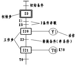 如图所示,在初始步S0,没有驱动动作,S20为其转移目标,X0、X1为串联的转移条件;在S20步, Y1为其驱动动作,S21为其转移目标,X2为其转移条件。