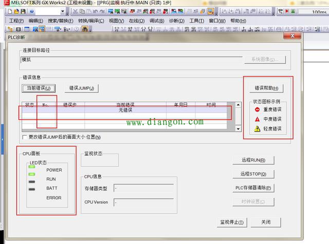 2、不能通过观察判断的故障,通过GX works 2里面的PLC诊断功能来查看故障代码,然后在编程手册里找到对应的故障代码信息及解决方法。