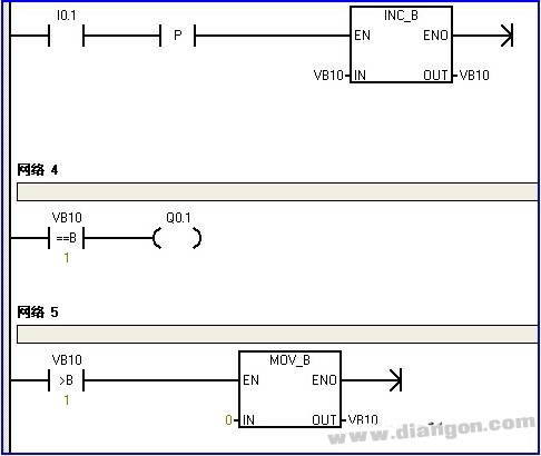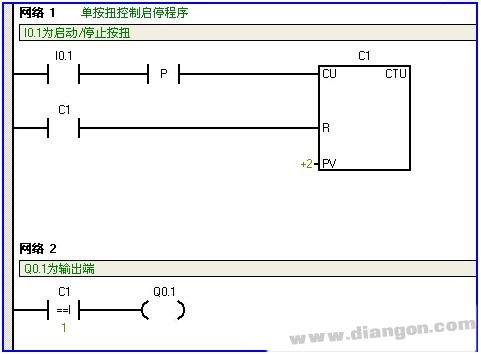 以下为西门子单按扭实现启停的程序;其中I0.1为启停按扭,Q0.1为控制输出;