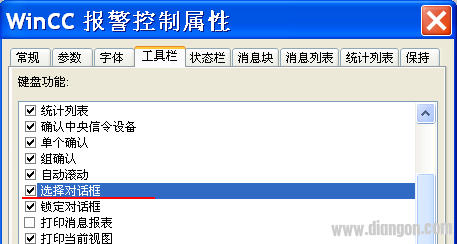 在组态报警控件时双击控件,在“WinCC报警控制属性”对话框中选择“工具栏”,把“选择对话框”勾选上(图3),保存设置。