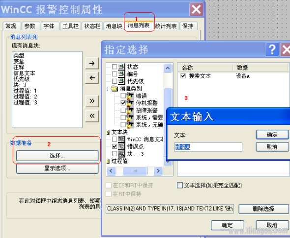 双击报警控件,在“WinCC报警控制属性”对话框中选择“消息列表”,然后单击“数据准备”区域中的“选择”按钮,在“指定选择”对话框中,通过对左边列表中复选框的选择,可以任意组合过滤条件(图2)。