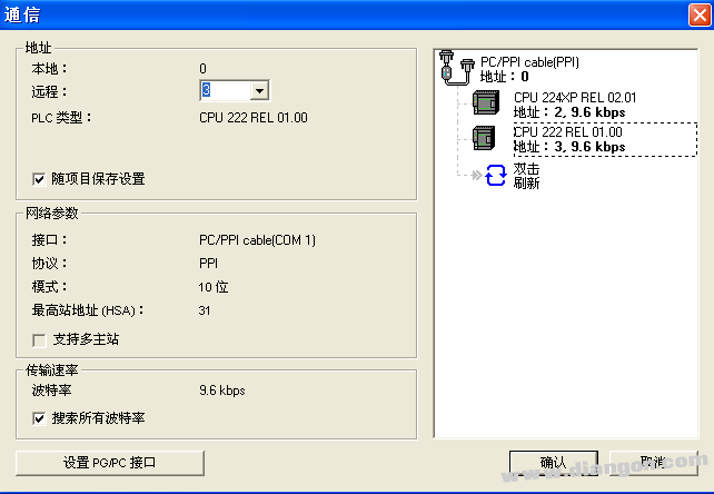 首先,用PC/PPI编程电缆将两台PLC的网络站地址分别设置为2和3,波特率都为9.6Kbps。这时,将编程电缆连接到任一个CPU带可编程插口的DP插头上,查找两台PLC的站地址,如图2所示。