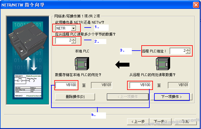 2. 代表定义应该从远程PLC读取多少个数据字节(NETR)或者应该写到远程PLC多少个数据字节(NETW),每条网络读写指令最多可以发送或接收16个字节的数据;