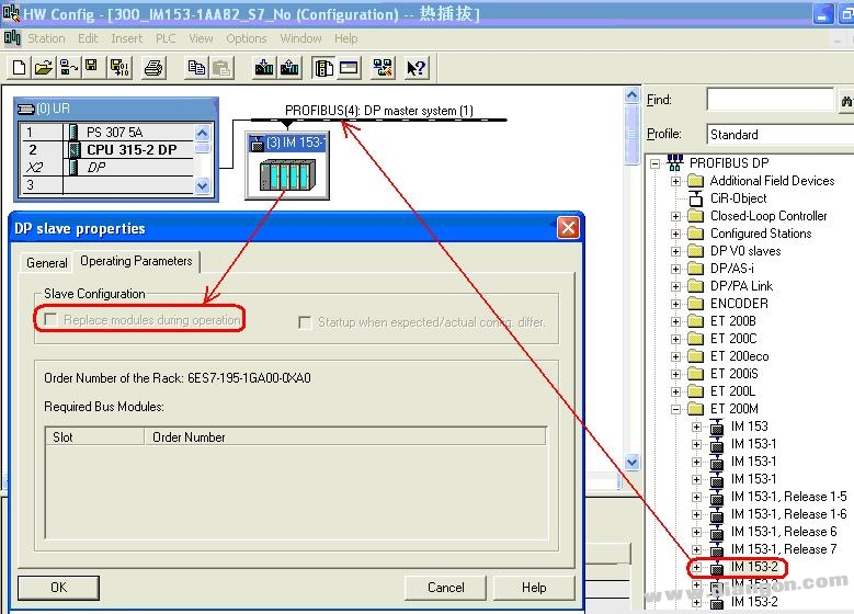 从上图可以看出,当你从右侧的PROFIBUS DP树型目录中将IM153-2模块拖到PROFIBUS总线上后,双击点开IM153的属性,“Repalce modules during operation”(热插拔功能)选项为灰色,所以在这种方式下,无法实现热插拔的全部功能,只能实现第1、2两条,不能实现第3、4条功能。