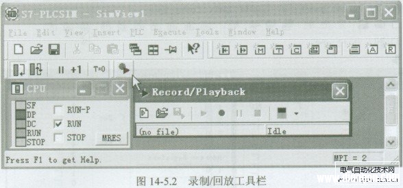 1.程序执行模式选择 为了选择仿真plc的程序执行模式,在S7-PLCSIM应用窗中设置有“程序执行模式”选择快捷按钮,用于选择程序执行模式。 程序执行模式快捷按钮布置如图14-5.1所示,图中自左向右对应按钮所选择的程序执行模式依次为:单循环扫描方式、连续循环扫描方式、PLC暂停方式、再次单循环扫描方式、全部定时器复位方式。点击按钮可以逐一打开仿真的对象。  当选择单循环扫描方式时,CPU只执行一个扫描周期,用户可以通过单击“再次单循环扫描方式”快捷按钮,或者通过选择菜单“Execute”一选择子项“Next Scan”,再次执行单循环扫描。 连续循环模式与实际CPU正常运行状态相同。 无论在何种模式下,仿真PLC都可以通过单击快捷按钮“PLC暂停方式”(Pause),进行PLC的程序暂停。 同样,仿真PLC的执行模式快捷按钮也可以在菜单“Execute”下通过选择选择不同的子项实现。 2.录制与回放 点击“录制/回放”快捷按钮(图14-5.2中鼠标所指的按钮),或者选择菜单“Tools”一“Record/Playback”,可以在显示区弹出图14-5.2所示的“录制/回放”工具栏。  “录制/回放”工具栏提供了类似“录音机”的操作界面,可以把仿真CPU在运行过程全部“录制”下来,并作为一个文本文件保存:也可以将录制好的运行过程通过“回放”进行重现。在“回放”过程中,可通过调整回放速度,进行程序运行时所发生的事件的重新检测。 |