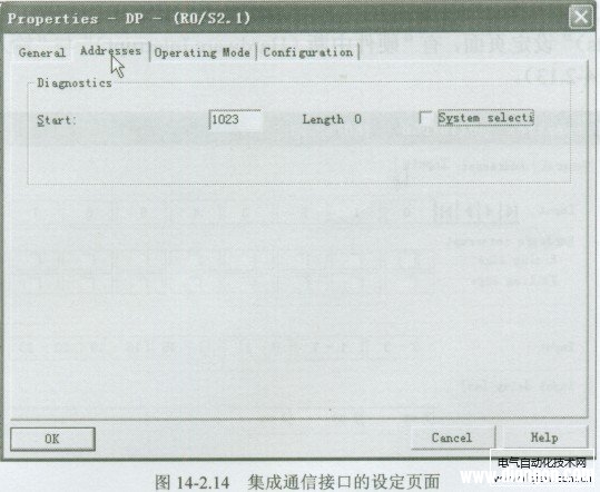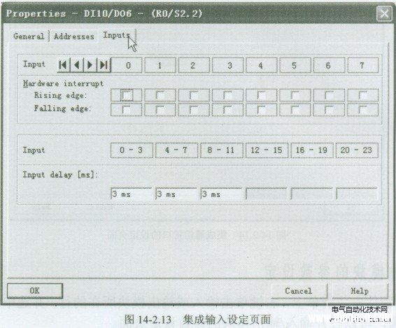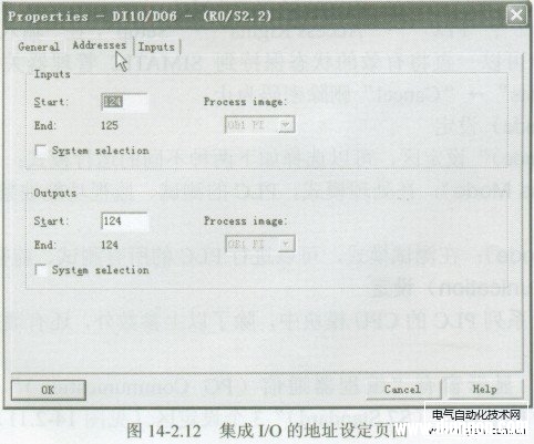 对于CPU 31*C紧凑型CPU,由于CPU模块本身集成有I/O点,对于这些I/O点,同样需要设定其属性参数。 在硬件安装清单上,右键单击CPU模块集成I/O所在的行,并选中“对象属性( Obj ect Properties...)”选项,可以打开集成I/O的参数设定页面。 通过设定页面不同的标签,可以打开不同的参数设定对象。 在基本参数( General)设定页面,可以在“简介(Short)”栏显示集成I/O的特征参数。在“地址( Address)”设定页面,可以显示与设定集成I/O的起始地址,地址也可以通过选定“系统选择(SVqtem qelection)”诜项,由plc讲行白动分配(见图14-2.12)。 1.集成输入设定 在“输入(Inputs)”设定页面,有“硬件中断(Hardware Interrupt)”与“输入延时(Input delay)”两个设定区(见图14-2.13)。  在“硬件中断( Hardware Interrupt)”设定区,可以逐点显示与设定集成输入是否作为硬件中断输入。当作为硬件中断输入时,还可以选择中断输入的生效方式,即:上升沿( Rising edge)有效、下降沿( Falling edge)有效。当上升沿(Rising edge)、下降沿(Falling edge)同时选择时,两者同时有效;当都不选择时,集成输入不能作为硬件中断输入。 在“输入延时(Input delay)”设定区,可以以4点为单位设定输入延时时间。输入延时时间也称“输入滤波时间”。通过延时的设定,使得输入信号的状态保持必须在设定时间以上,才能生效,从而可以消除信号干扰对PLC执行带来的影响。 2.集成通信口的设定 对于具有第2接口的CPU模块(如-2DP等),由于CPU模块带有第2通信接口,因此需要设定其属性参数。 在硬件安装清单上,右键单击CPU模块第2接口所在的行,并选中“对象属性( Object Properties...)”选项,可以打开第2接口的参数设定页面。 通过设定页面不同的标签,可以打开不同的参数设定对象。 在基本参数( General)设定页面,可以显示第2接口的特征参数与设定网络地址。网络地址的设定,需要进一步选择“接口(Interface)”栏中的“属性(Properties...)”选项。 在“地址( Address)”设定页面,可以设定第2接口诊断缓冲区的地址,也可以通过选定“系统选择( System selection)”选项,由PLC进行自动分配(见图14-2.14)。  在“操作方式( Operation Mode)”设定页面,可以选择第2接口作为“主站(DP master)”或“从站(DP slave)”。 在“配置(Configuration)”设定页面,可以配置主从通信(Master- Slave,MS)或直接数据交换方式( Direct Data Exchange,DX)。 |