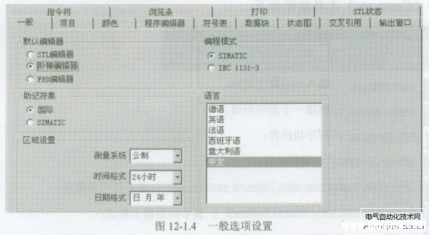 通过主菜单项“工具( Tools)”一“选项(Options...)”一“一般(General)”,可打开一般设置菜单,可以显示如图12-1.4所示的设置页面。页面包括“默认程序编辑器”、“编程模式”、“助记符集”、“语言”、“区域设置”等选择框。 在“默认编辑器”选择框中,可以选择由STEP7-Micro/WIN32软件所提供STL(语句表)、LAD(梯形图)、FBD(逻辑功能图)三种编程语言。 在“编程模式”选择框中,可以选择SIMATIC和IEC1131-3两种基本指令系统,其中SIMATIC指令集专为S7-200 plc设计,选中后可以选择STL、LAD、FBD三种编程语言;IEC1131-3指令集为通用PLC语言,只能用梯形图与逻辑功能图进行编程。  |