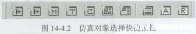 为了选择仿真的对象,在S7-plcSIM应用窗中设置有S7-PLCSIM仿真用的“仿真对象选择”快捷按钮,用于指定与显示仿真对象。按钮布置如图14-4.2所示,点击按钮可以逐一打开仿真的对象。