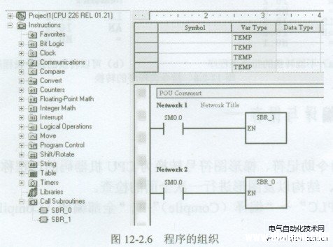 在主程序中,可以首先编辑子程序、中断程序的调用条件(触点的逻辑条件),并通过打开指令树中的指令文件夹(Instructions)打开指令分类文件夹Call Subroutines,再双击相应的子程序号,即可输入子程序、中断程序的调用功能框,以完成程序的组织过程(见图12-2.6)。