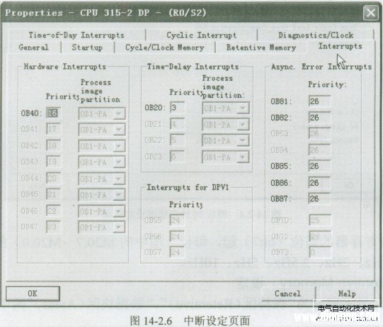 打开该设定对象,显示窗分为“硬件中断( Hardware Interrupts)”、“延时中断(Time-DelayInterrupts)”、“PROFIBUS-DP中断(Interrupts for DPVl)”以及“异步出错中断(Asynchronous ErrorInterrupts)”四个区域(参见图14-2.6)。  设定用于S7-400 plc,在S7-300 PLC中,原则上本设定区不可以进行修改。 ①硬件中断(Hardware Interrupts)设定:该区有8个选项,可以选择不同的中断执行程序( OB40~47)与优先级(Priority)。 ②延时中断(Time-Delay Interrupts)设定:该区有4个选项,可以选择不同的中断执行程序( OB20~23)与优先级(Priority)。 ③PROFIBUS-DP中断(lnterrupts for DPVl)设定:该区有3个选项,可以选择不同的中断执行程序( OB55~57)与优先级(Priority)。 ④异步出错中断(Asynchronous Error Interrupts)设定:该区有10个选项,可以选择不同的中断执行程序( OB70、72、73、OB81~87)与优先级(Priority)。 |