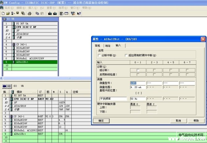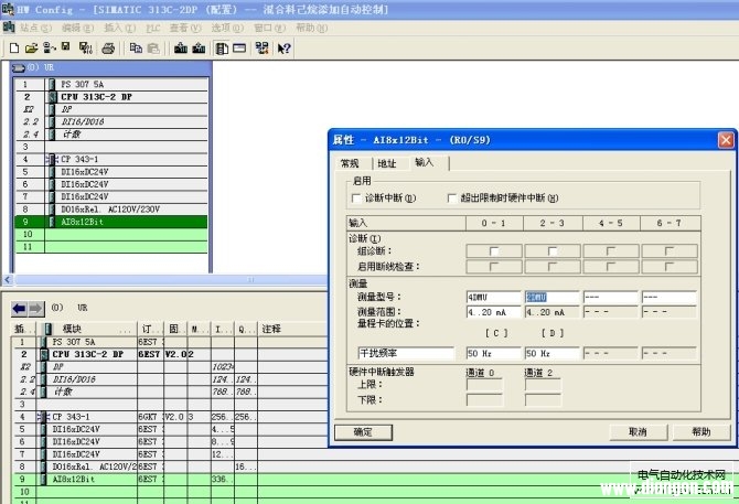 西门子plc8路模拟量输入模块(型号为:AI8X12Bit,订货号为:  ),当通道配置为电流输入时,是很有讲究的。很多刚入门的新手都没搞清楚究竟该如何配置,如何选择该模块上的量程卡的正确插槽位置,现详述如下: 首先,我们必须搞懂什么是“两线制电流信号”输入,什么是“四线制电流信号”输入。 简而言之:当传感器自带供电电源,通过两根电流信号线向外输送一个0~20mA或4~20mA的电流环信号,而无需 PLC通过模拟量模块的接口向其提供24VDC供电时,我们称其为“四线制电流信号”。此时,应将该回路通道上的电流输入模拟量信号配置为4DU (4~20mA),模拟量输入模块量程卡的位置配置为[C],如下图所示:  当传感器本身不带供电电源,需要 PLC模拟量输入模块向其提供24VDC的外供电时,我们称其为“两线制电流信号”。在“两线制电流信号”的配置下,模拟量输入模块上电流信号和电压信号是共用的两根线。此时,应将该回路通道上的电流输入模拟量信号配置为2DU (4~20mA),模拟量输入模块量程卡的位置配置为[D],如下图所示:  以上两种配置,在实际中千万不能弄错了! 若配置错误,比如将“有源”的四线制电流输入信号误配置为“无源”的两线制电流输入信号,则 PLC的模拟量信号输入接口将承受外部输入电流信号带来的24VDC供电,这很容易导致烧坏 PLC的模拟量输入模块!!! 在实际应用中,要千万小心,注意他们两者之间的区别。 |