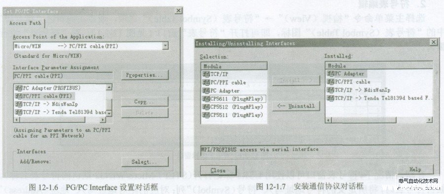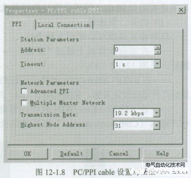 当利用编程器或编程计算机进行程序的传送、现场编辑、调试与诊断时,为了建立编程器或编程计算机与plc间的通信,除需要进行相应的编程电缆等硬件连接外,还需要设定编程器或编程计算机的通信选项。 S7-200 PLC与编程计算机间一般通过PC/PPI电缆进行连接,电缆的RS-232端连接编程计算机的串口( COM1、COM2),RS-485端连接PLC-CPU模块上的RS-485接口。 编程计算机的通信端口的中断和地址资源可以通过计算机操作系统中的设备管理器进行设置,要确保编程计算机没有中断冲突和地址区域重叠的现象。编程计算机中的“SET PG/PC Interface”选项是实现与PLC之间通信接口的设置选项,可以通过如下方法进行设置操作。 (1)打开设置选项 打开设置选项可以采用3种方法: ――在编程计算机上通过“开始”一“设置”一“控制面板”,并双击“SET PG/PC Interface”图标,见图12-1.5 (a); ――在STEP7-Micro/WIN软件应用窗的浏览条(Navigation Bar)区,通过点击‘‘通信(Communications)”图标打开通信设定页面,见图12-1.5 (b),并双击PC/PPI电缆图标,见图12-1.5 (c); ――在STEP7-Micro/WIN软件应用窗中通过主菜单“检视(View)”一“元件(Component)”一“通信(Communications)”打开通信设定页面,并双击PC/PPI电缆图标,见图12-1.5 (c);   通信接口的设置对话框如图12 -1.6所示。 (2)选定应用访问点 应用访问点的选定,可以用通过选择对话框“接口参数配置(Interface Parameter Assignment)”栏下显示的PC/PPI cable( PPI)图标进行。将对话框中的“应用访问点(Access Point of theApplication)“设为PC/PPI cable (PPI). (3)安装通信协议 通信接口的设置对话框中,选择“Select....”按钮,可以打开通信协议安装页面(见图12-1.7),并安装相应的通信模块与通信协议。 在通信协议安装页面的“通信模块( Module)”栏可以选择通信模块的类型,对于编程计算机与PLC间的通信选择PC/PPlcable (PPI)。 利用页面中的“安装(Install)”和“下载(Uninstall)”可以执行通信协议的安装和删除操作。 (4)接口参数设置 在通信接口的设置对话框中,点击“属性( Properties...)”选项,可以打开接口参数设置页面(见图12 -1.8)。页面包括“站参数(Station Parameters)”、“网络参数(Network Parameters)”两部分。  为了使编程计算机与PLC连接,应在站参数栏的“地址Address”选项中输入PLC在STEP7-Micro/WIN软件中的地址号“0”;在“超时选项Timeout”选项中输入编程计算机与PLC间建立通信连接所需的最大时间。 在“网络参数Network Parameters”栏中,可选择“单主站Advanced PPI”或“多主站Multiple Master Network”连接模式,可以根据PLC系统的实际情况选择,只是编程计算机与PLC连接时不需要选定。 “通信速率Transmission Rate”选项可以设定编程计算机与PLC连接时的通信速率,一般情况下可以选择19.2或9.6kbit/s。 “最高节点地址Highest Node Address”栏为通信地址设定,可以使用默认值"31"。 |