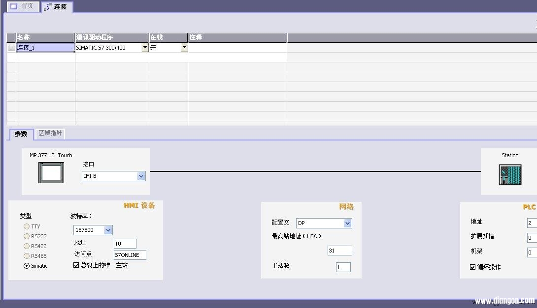 2、使用PROFIBUS-DP方式通讯时,CPU端通讯插头连接在CPU的DP端口上,同时触摸屏上也设置为PROFIBUS-DP通讯;