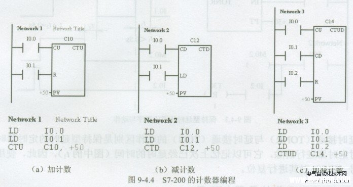 西门子S7-200plc的计数器梯形图与指令表编程方法如图9-4.4所示,图中的PV为计数设定值输入端,R为复位输入端。