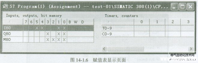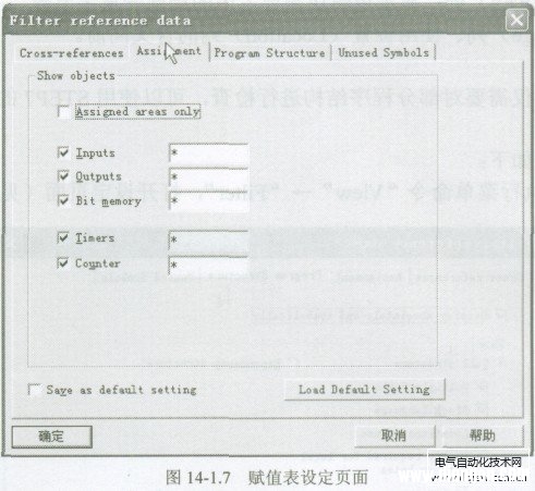 1.赋值表显示 在调试时使用赋值表,主要是查看某一信号是否已经被使用,是否有未使用或遗留的输入点,或者有可以供使用的标志寄存器等内容。 赋值表( Assignment)的显示页面如图14-1.6所示。图中打“×”的信号表示已经在程序中使用,未打“×”的信号表示未使用。  当存储器或者信号以字节、字、双字形式使用时,显示区内为蓝色显示。 2.赋值表设定 同样,当plc程序较复杂时,如果在赋值表中显示全部PLC信号的情况,显示内容会显得很大。假如在检查程序时仅仅需要对部分信号进行检查,可以使用STEP7的过滤器功能进行筛选、设定。 赋值表设定步骤如下: ①在赋值表中执行菜单命令“View”一“Filter”,打开设定页面(见图14 -1.7):  ②在设定页面中选择赋值表选项。 赋值表选项设定可以设定如下内容: 信号显示的范围(Assigned areas only):可以选择显示的信号类型与地址范围。在信号类型前通过“√”选定对象,并在输入框内输入需要显示的地址。 如:在输入信号(Input)输入框中输入“*”为显示全部输入信号;输入0~10表示显示IBO~IBIO;输入20表示只显示IB20等。 赋值表显示的信号类型只能是输入信号I (Inputs)、输出信号Q(Outputs)、标志寄存器M(Bitmemory)、定时器T(Timers)、计数器C(Counter)。 也可以直接装载默认的设定( Load Default Setting),或者将所选择的内容作为默认设定(Save asdefault setting)。 |