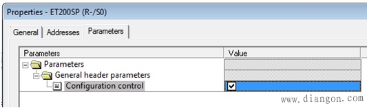 要实现组态控制,首先双击ET200SP,在属性对话框的参数标签下使能ET200SP组态控制功能,如图3所示: