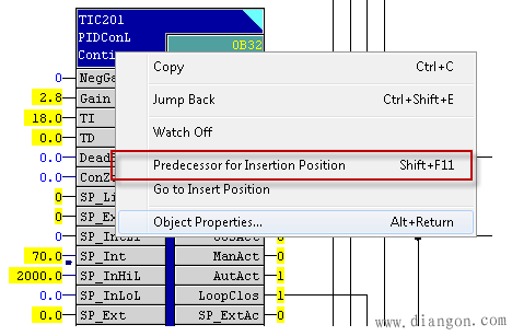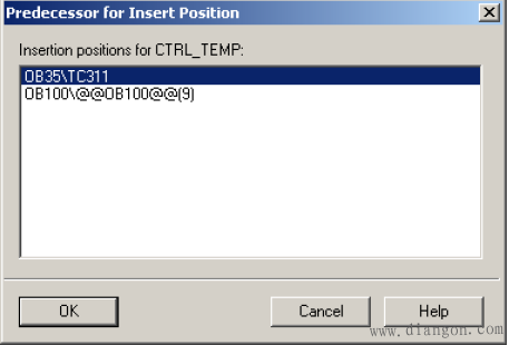 由于“PIDConL”功能块在两个OB中均有调用,所以还需要指定在哪个OB块下定义为插入点(如下图):