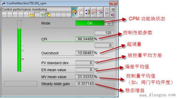 CPM功能块可以通过监控和统计控制回路的数据,计算出控制回路的动态特性和稳态特性,以数据的方式帮助操作人员直观的分析控制回路的控制性能,帮助维护人员及时的发现控制回路参数的失配或现场控制设备控制性能的衰减,起到提早预防自动控制失效等故障情况的出现。