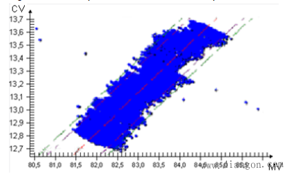 概率分布图是一个二维散点图,纵轴是CV(controlled value),也就是PV值。横轴是MV值。图中记录的每一个点代表的是每一个阀门开度对应的过程值,采样频率等于CPM所在功能块的执行周期。根据阀门的曲线特性以及可控区间的线性原则,理想情况下,记录的点应该是呈椭圆状分布于这个二维图中。
