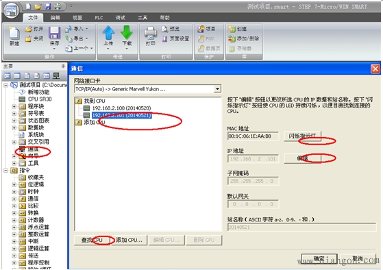 双击“通讯”,弹出通讯界面,点击“查找”,系统自动查找CPU,图示界面因为连接了2台CPU,所以查找后就显示出2台CPU信息。选中查找到的某个CPU,点击“编辑”,就可以编辑改变这台CPU的IP地址以及站名称。以上2台A/B机就分别编辑改变IP地址为192.168.2.100/192.168.2.101;站名称为20140520/20140521。另外“闪烁指示灯”功能对于多台CPU连接很重要,单击后连接的那台PLC的“RUN”、“STOP”、“ERROR”指示灯就会走马灯闪现,这样就很容易找到联机是那一台PLC。